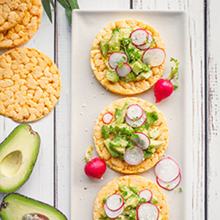 Maiskaker med avokado, reddiker, spirer og sesamfrø