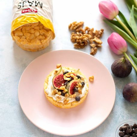 Bred kremost over maiskakene, topp med fiken, valnøtter, sjokolade og topp med litt agavesirup/honning.