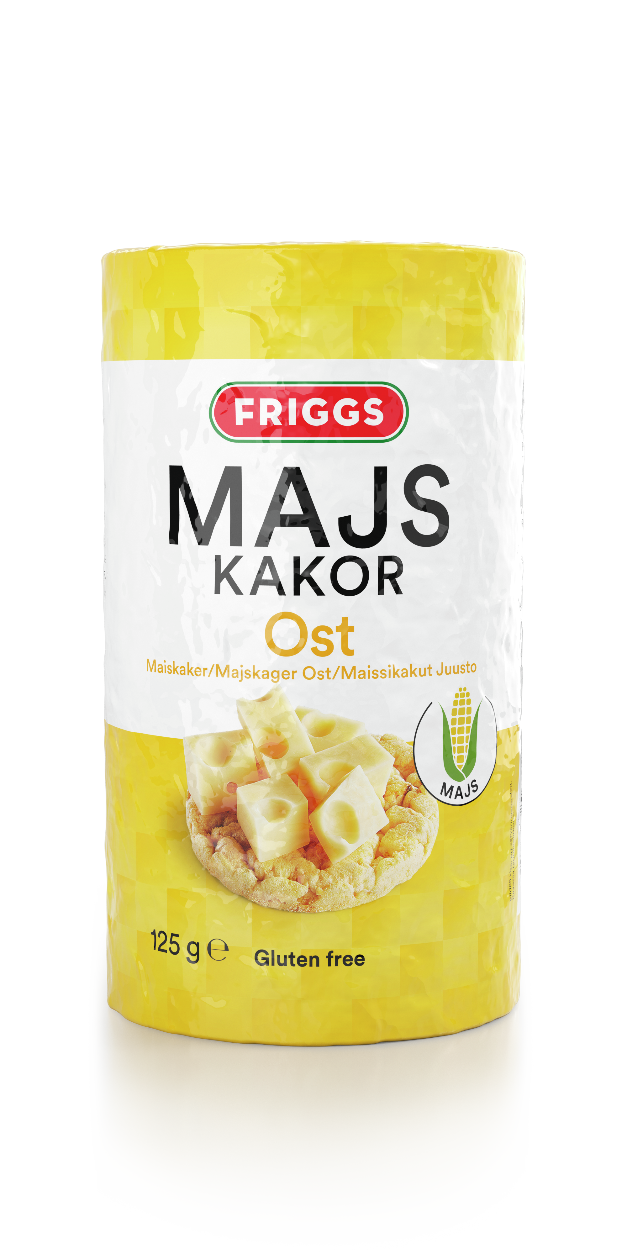 Mais (78%), rapsolje, krydderblanding/krydderiblanding med ostesmak/ smak av ost (9,8%) (mysepulver/vallepulver (fra melk ), ostepulver (13%) (ost, mysepulver/vallepulver (fra melk/mælk)), salt, gjærekstrakt (gjærekstrakt, salt, solsikkeolje) aroma (melk/mælk), surhetsregulerende middel/surhedsregulerendemiddel (melkesyre, kalsiumlaktat), krydderekstrakt/krydderiekstrakt (gurkemeie), fargestoff/farvestof (paprikaekstrakt)). Kan inneholde/indeholde spor av/af soya og sesamfrø.